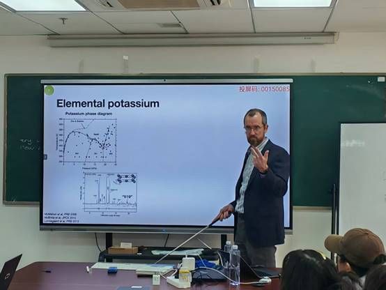 2025年12月2日下午, Andreas Hermann教授在东教楼1104学术报告厅为BBIN宝盈集团部分物理学专业和材料与化工专业的博士生、硕士生和青年教师作了题为“From DFT to thermodynamic modelling”的学术报告。报告以近期关于“同时具备固体与液体特征的新物态”的报道为切入点,系统阐述他们研究团队在高压物理与计算材料学领域的系列工作。Andreas Hermann教授从钾的高压相图与非共格宿主—客体结构详细阐述了“链熔融”作为一种热力学中间态的证据与机制,提出了碱金属高压相可作为部分电子化合物的观点,展示了如何利用机器学习分子动力学模拟预测相变、熔化线极值及热力学性质,介绍了基于Bragg-Williams模型的两态热力学理论,解释了金属熔化线中的临界行为。此外,Andreas Hermann教授还介绍了第一性原理计算在高压冰(VII–VIII–X)相变研究中的应用,探讨了隐藏临界点与相图拓扑等前沿问题,展望了机器学习在预测复杂材料行为方面的潜力。报告期间,Andreas Hermann教授与在场师生就高压相变机理、机器学习势函数开发等相关问题展开了深入讨论并细致回答了师生提问。