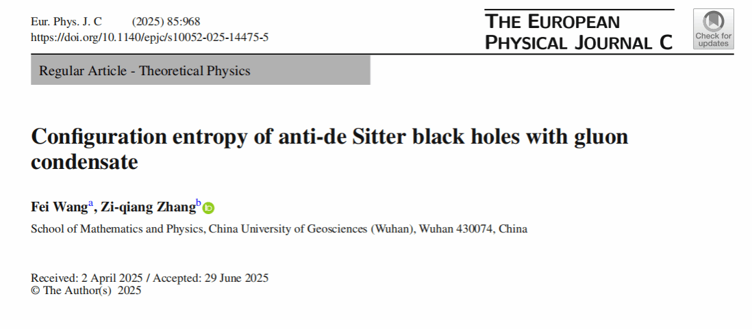 近日,张自强老师团队再传捷报,两篇核心研究论文相继发表于粒子物理与场论领域国际权威期刊《European Physical Journal C》。博士生王非在其指导下完成的论文《Configuration entropy of anti-de Sitter black holes with gluon condensate》(Paper No. 968),聚焦含胶子凝聚的反德西特(AdS)背景构型熵研究。作为量子色动力学的核心概念,胶子凝聚直接反映胶子场在强相互作用下的凝聚状态,对解析强子结构与性质具有关键意义。该研究系统阐明了特定背景下构型熵的演化规律及其与系统稳定性的内在关联,明确胶子凝聚对相变临界温度的调控效应:胶子凝聚强度增加会导致临界温度升高,同时构型熵随凝聚强度降低,这一发现印证了胶子凝聚对黑洞及等离子体稳定性的增强作用,与热解离理论的前期结论形成呼应,为理解AdS空间热力学相变提供了全新理论依据。