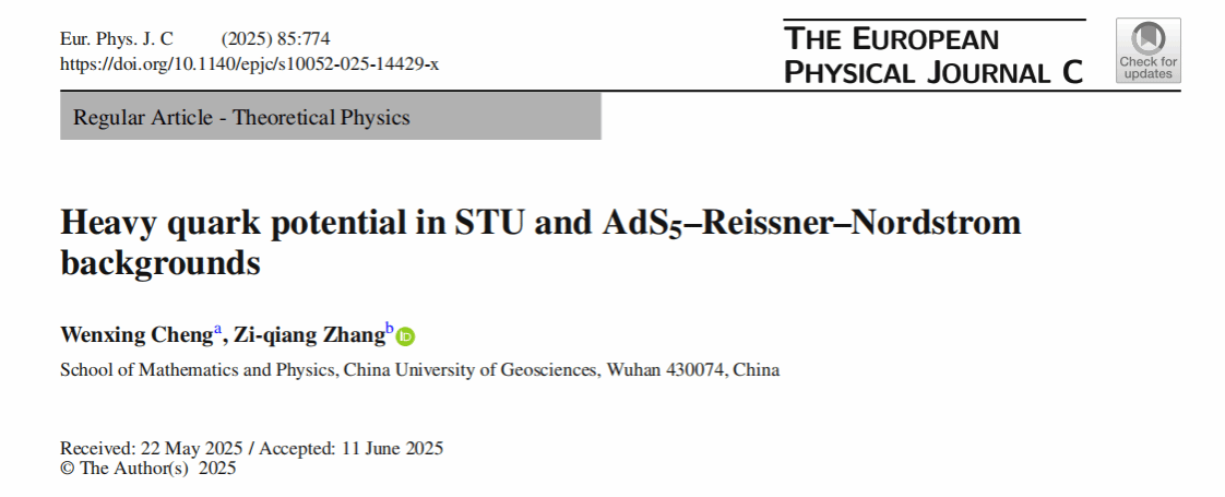 硕士生程文星在其指导下完成的论文《Heavy quark potential in STU and AdS5-Reissner–Nordstrom backgrounds》(Paper No. 774),针对STU与AdS5-Reissner–Nordstrom 两类典型背景,开展重夸克势的系统性探究。基于弦理论世界面极值化原理,通过对附着于边界重夸克-反夸克对的开弦世界面进行极值化分析,团队取得突破性发现:两类背景下的重夸克势均与黑洞电荷呈现强关联性,电荷增加会导致重夸克势升高,进而削弱重夸克间相互作用强度。这一成果丰富了弦理论框架下的重夸克物理体系,为后续复杂背景下的重夸克势研究提供了可复用的分析范式。更具实践价值的是,研究进一步推论:夸克胶子等离子体(QGP)中化学势的引入会产生与黑洞电荷类似的效应,即削弱重夸克相互作用,这为 RHIC、LHC等对撞机实验中QGP的重夸克扩散、束缚态演化等现象的解释提供了关键理论预判。