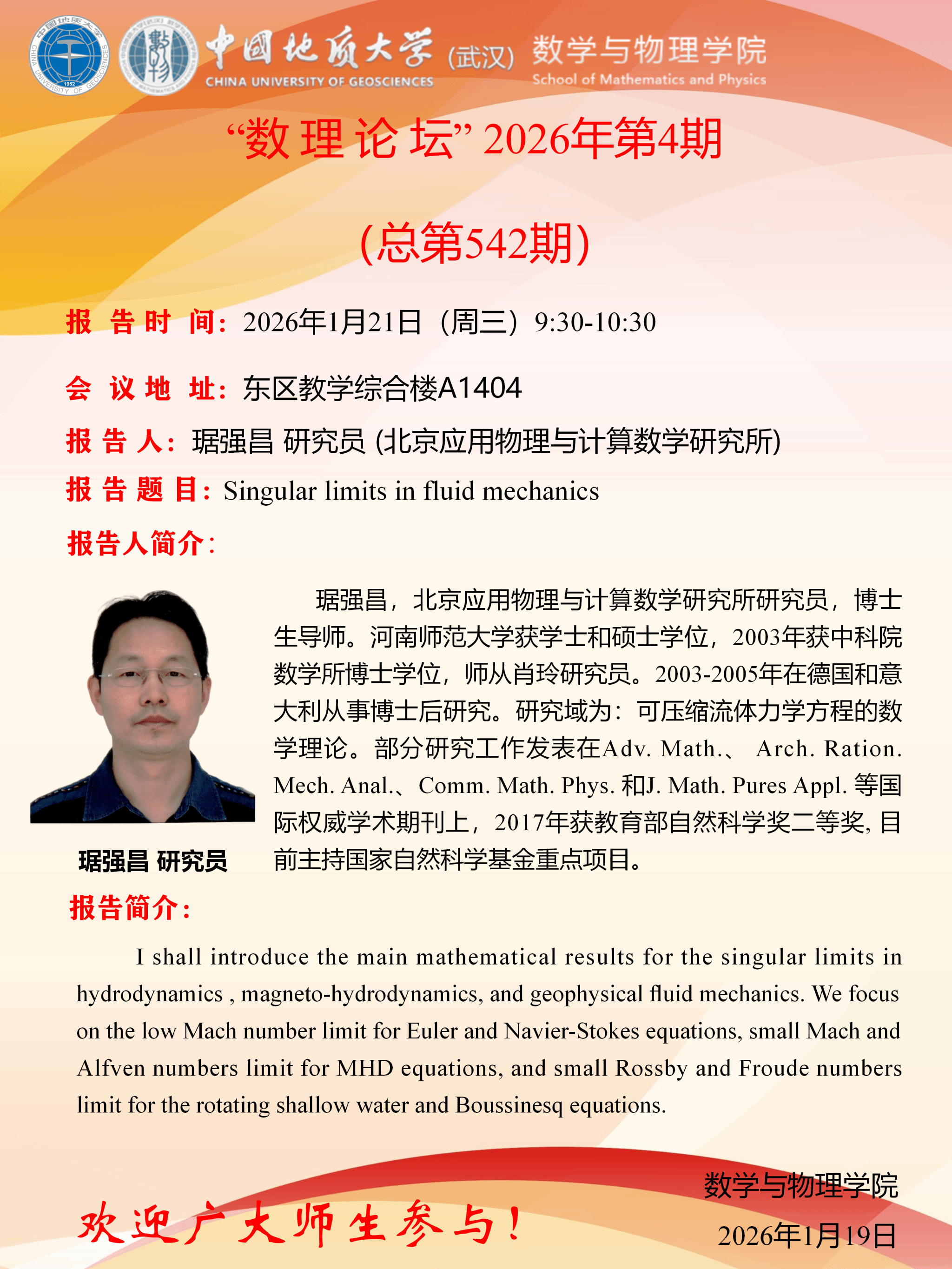 2026年1月21日琚强昌研究员学术讲座: Singular limits in fluid mechanics