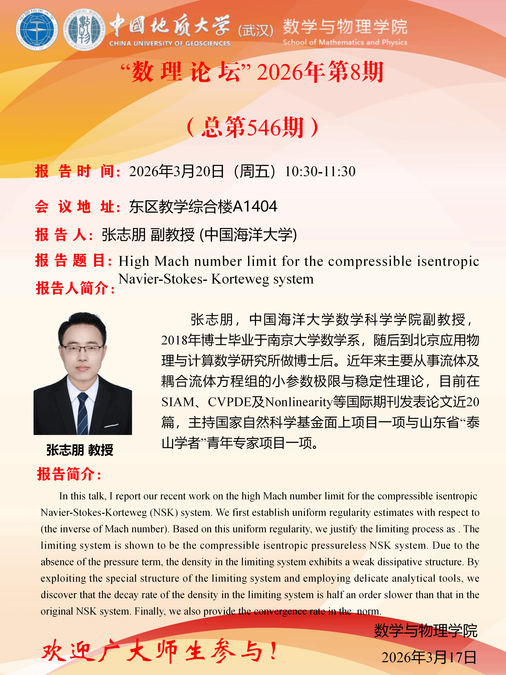 2026年3月20日张志朋副教授学术讲座:High Mach number limit for the compressible isentropic Navier-Stokes- Korteweg system